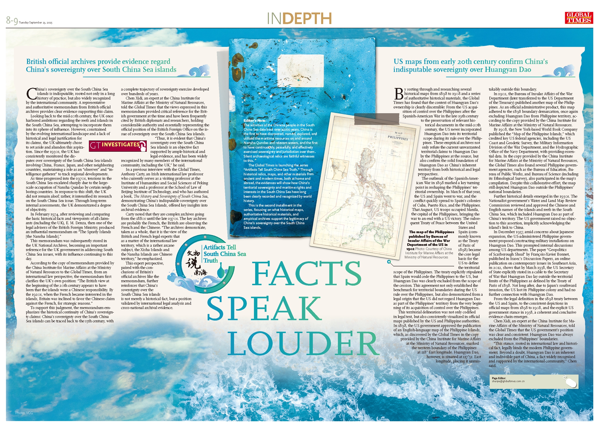 By sorting through and researching several historical maps from 1898 to 1908 and a series of authoritative historical materials, the Global Times has found that the context of Huangyan Dao's ownership is clearly discernible: From the US acquisition of control over the Philippines after the Spanish-American War in the late 19th century to the preservation of relevant historical documents in the mid-20th century, the US never incorporated Huangyan Dao into its territorial scope during its rule over the Philippines. These empirical archives not only refute the current unwarranted territorial claims to Huangyan Dao by the Philippines at the source, but also confirm the solid foundation of Huangyan Dao as China's inherent territory from both historical and legal perspectives.